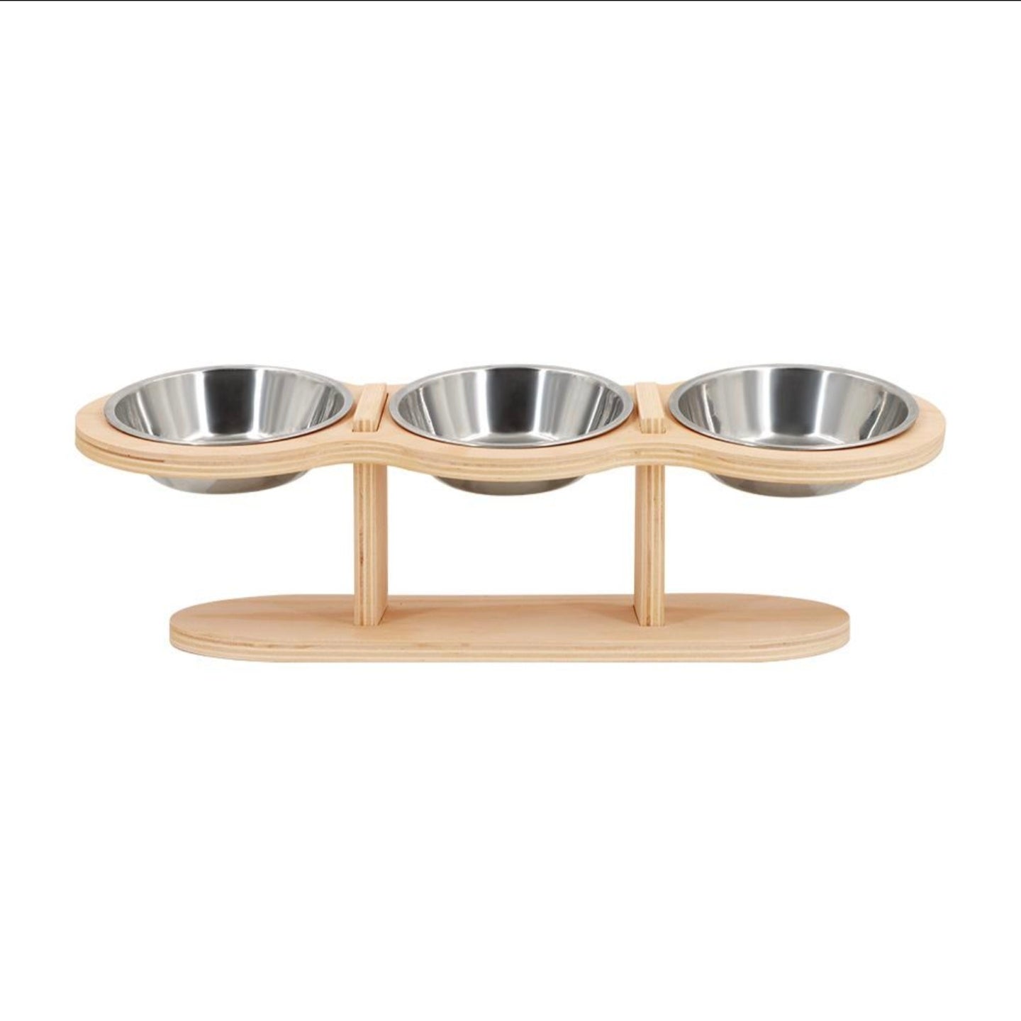Drei Edelstahlschalen für Trockenfutter, Nassfutter und Wasser – alles an einem Platz, ordentlich & praktisch.